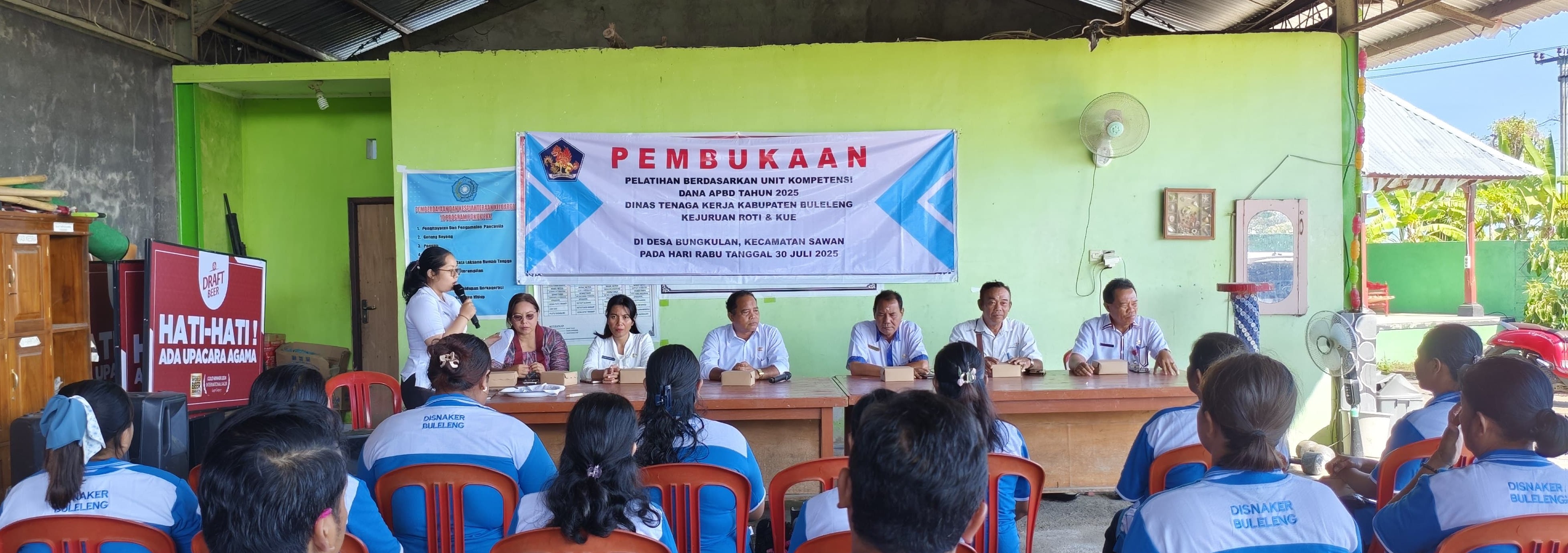 Rabu 30 Juli 2025, bertempat di Aula Kantor Desa Bungkulan, Kecamatan Sawan, Plt. Kepala Dinas Tenaga Kerja Kabupaten Buleleng, Nyoman Suarjana, S.Pd., M.Pd., menghadiri sekaligus membuka Pelatihan Berdasarkan Unit Kompetensi Dana APBD Tahun 2025 Program Pelatihan Pembuatan Roti & Kue.