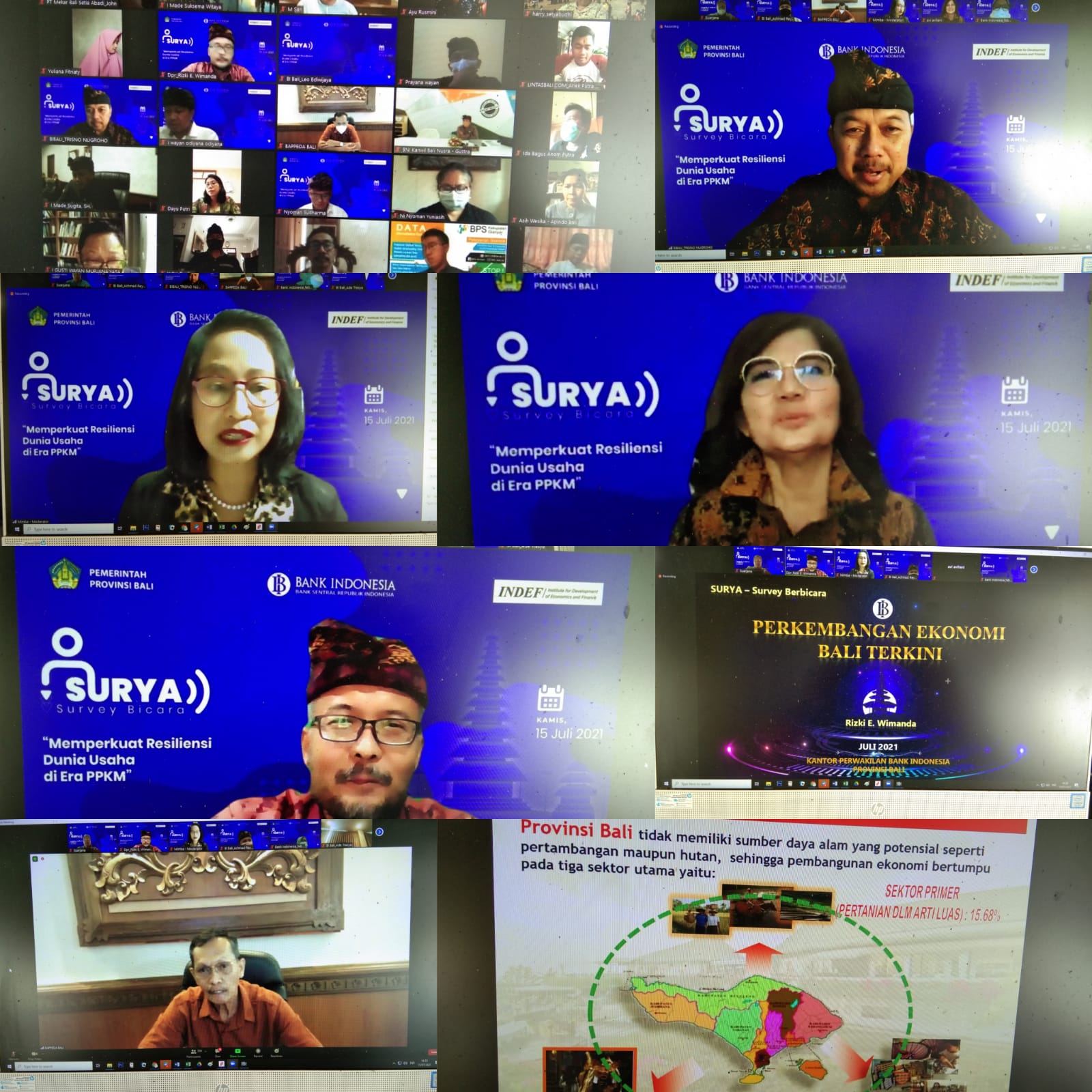 Webinar dibuka oleh Kepala BI Perwakilan Bali Trisno Nugroho, yang diikuti oleh 400 orang. Dalam sambutannya menyampaikan bahwa kebijakan PPKM Darurat harus mendapat dukungan semua pihak agar kasus COVID-19 terkendali dan semakin cepat perekonomian bangkit. Adapaun sebagai nara sumber adalah Rizki E. Wimanda dari BI Perwakilan Bali dengan materi Perkembangan ekonomi bali terkini, Aviliani dengan materi Pemulihan Ekonomi global dan domestik terhadap perekonomian bali dan Strategi Provinsi Balu Dalam Mendorong Pemulihan Ekonomi Bali oleh Bappeda Prov. Bali