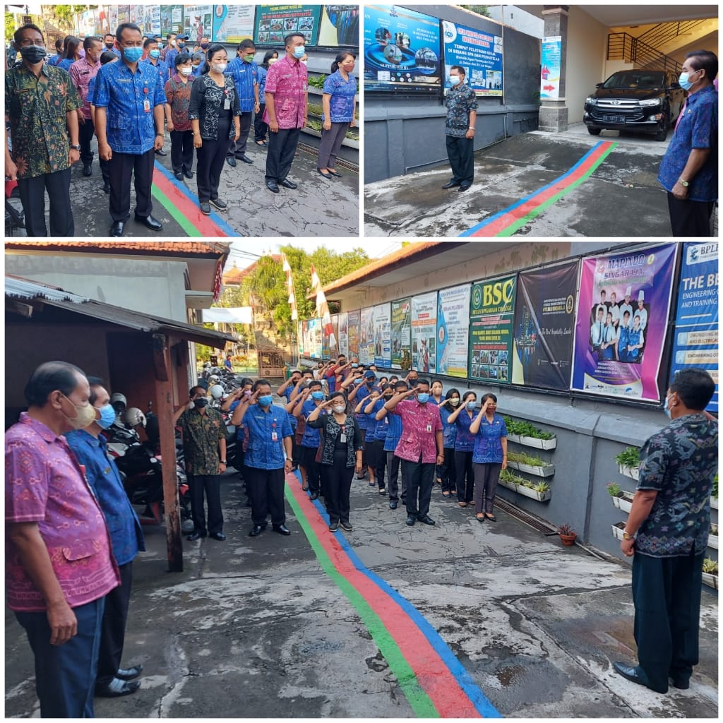 Selasa, 22 Maret 2022, Pelaksanaan Kegiatan Rutin Apel Pagi Dinas Tenaga Kerja Kab. Buleleng, dilanjutkan dengan pelaksanaan Puja Trisandya bersama. Apel pagi ini dipimpin oleh Kepala Bidang Pelatihan dan Produktivitas Tenaga Kerja, I Made Sadipa, S.H., diikuti Sekretaris Dinas, Kabid, Kasi, dan seluruh Pegawai Dinas Tenaga Kerja Kab. Buleleng dengan tetap menerapkan Prokes kesehatan Covid-19.