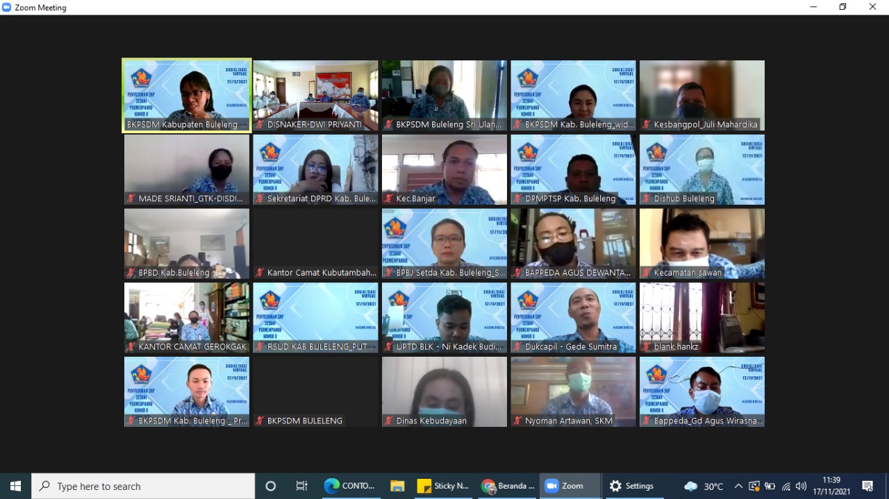 Rabu 17 November 2021 Kabid Lattas Made Sadipa,SH ,Kasubbag kepegawaian dan keuangan,Ni wayan Sri Utari,SE Kasi pemberdayaan lembaga dan produktifitas Tenaga kerja mengikuti secara virtual sosialisasi penyusunan SKP sesuai peraturan mentri PANRB No.8 tahun 2021 tentang manajemen kinerja PNS.Acara ini di buka secara resmi oleh Sekban BKPSDM Drs I Nyoman Wisandika dalam arahanya beliau menyampaikan secara umum mengenai Permenpan RB No.8 tahun 2021 tentang sistem manajemen kinerja PNS yang merupakan tindak lanjut dari terbitnya PP 30 tahun 2019 yang ditetapkan pada tanggal 26 April 2019.