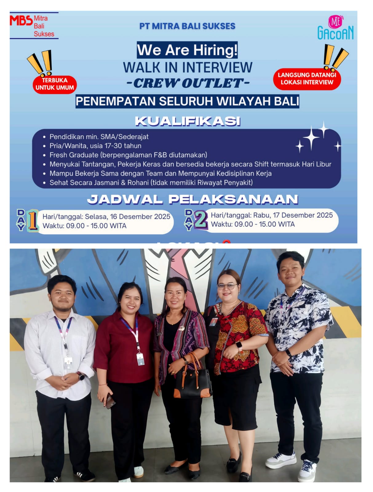 Kegiatan ini bertujuan untuk memfasilitasi proses penempatan tenaga kerja serta memperluas kesempatan kerja bagi pencari kerja (pencaker) di Kabupaten Buleleng. Dalam kunjungan tersebut, PT. Mitra Bali Sukses membuka lowongan kerja sebanyak 10 orang dengan kualifikasi pendidikan minimal SMA/SMK sederajat.