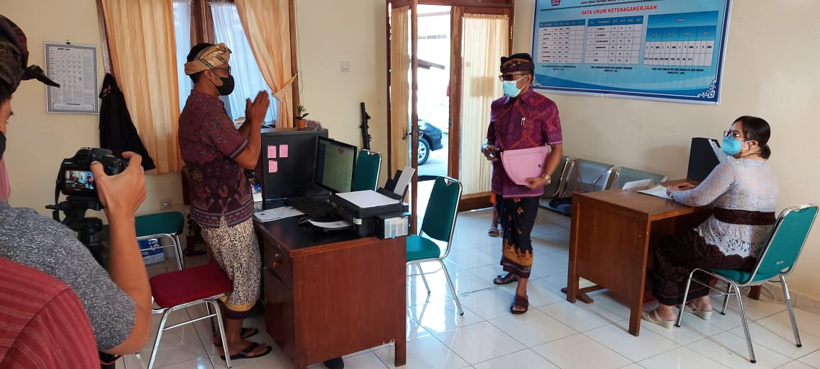 Dinas Tenaga kerja kabupaten Buleleng melaui Bidang Penempatan Perluasan Tenaga kerja dan transmigrasi melaksanakan proses pengambilan gambar vidio terkait Inovasi Pelayanan publik kamis 25 maret 2020 pengambilan vidio di lakukan oleh staf oprator Website dengan ilustrasi alur dan prosedur permohonan pembuatan AK 1,serta di perankan oleh pejabat dan staf pada Bidang Penta,