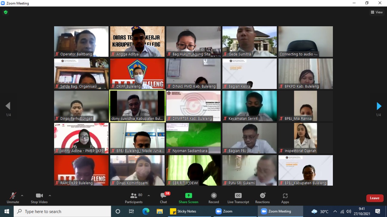 Dinas Tenaga Kerja mengikuti Undangan Bimtek Sistem Pengadaan hari Kedua pada hari Rabu, 27 Oktober 2021 yang dihadiri oleh Kepala Sub Bagian Perencanaan (Putu Sri Asmariati, SH) dan Adm SIRUP "Sistem Informasi Rencana Umum Pengadaan" diikuti juga oleh Adm SIRUP dan Adm Pengadaan lainnya yang ada di Lingkup Pemerintahan Kabupaten Buleleng. Kegiatan ini dibuka langsung oleh Kabag Pengadaan Barang/Jasa yang dimana Kabag memberikan motivasi dan mengingatkan adanya pengembangan Aplikasi SIRUP yang nantinya akan disiapkan untuk berintegrasi dengan SIPD pada tahun pelaksanaan di tahun 2022, selanjutnya Pemaparan Narasumber "Demo Teknis" dari PMEP LKPP (WINNY ADLINA).