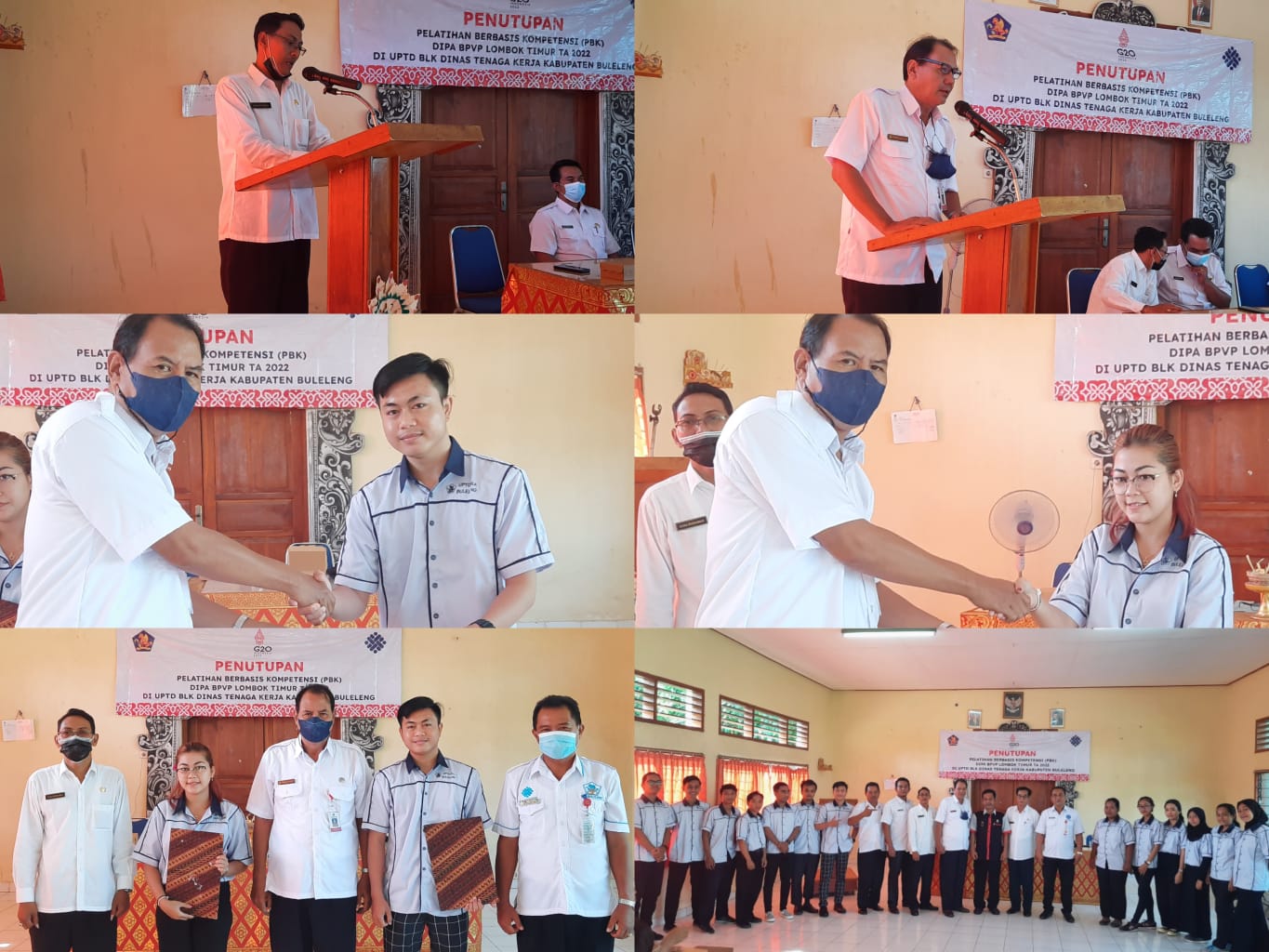 Rabu 15 Juni 2022, UPTD BLK Dinas Tenaga Kerja Kabupaten Buleleng, melaksanakan Acara Penutupan Pelatihan Tahap 1 tahun 2022 yang bertempat di Aula UPTD BLK. Kepala Dinas Tenaga Kerja Kabupaten Buleleng, yang dalam hal ini diwakili oleh Sekretaris Dinas Tenaga Kerja Kabupaten Buleleng, Nyoman Suarjana, S.Pd., M,Pd., secara resmi menutup pelatihan tahap 1 tersebut.