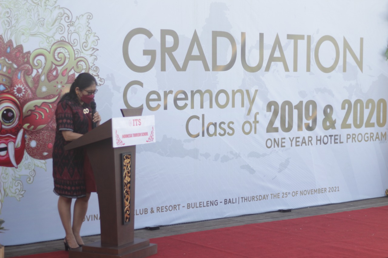 Kadisnaker (Ni Made Dwi Priyanti Putri K, SE) dalam sambutannya memberikan ucapan Selamat kepada Peserta Graduation dan arahan agar tetap berkompeten,siap bersaing di Dunia Industri di bidang keahlian masing-masing yang sudah didapatkan selama belajar di LPK Indonesia Tourism School, menerapkan dengan sebaik-baiknya apa yang telah di pelajari , serta menekankan kepada calon yang ingin berangkat agar melengkapi dokumen yang terstruktur agar tidak terjadi masalah dri awal Berangkat hingga setelah bekerja di Luar Negeri baik dari Ak.I sampai Rekomendasi Pasport. Dalam kesempatan ini ,diikuti 39 orang wisudawan/wati yang di lantik oleh Direktur Indonesia Tourism School diantaranya pada Bidang Ftont Office, Housekeeping, Service Restaurant & Bar , dan Culinary. Kegiatan ini dilaksanakan dengan tetap menerapkan protokol kesehatan.