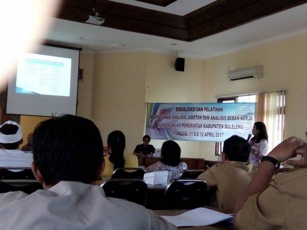 Dalam rangka sosialisasi dan pelatihan penyusunan analisis jabatan dan analisis beban kerja di lingkungan Pemerintah Kabupaten Buleleng Dinas Tenaga Kerja Kabupaten Buleleng yang dihadiri Kasubang Keuangan Wayan Sri Utari SE didampingi staff Luh Sri Bintari,SE selama 2 (dua) hari.