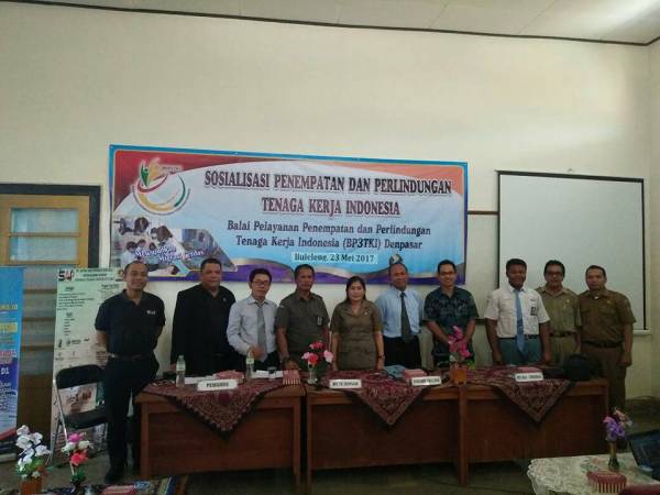 Kepala Dinas Tenaga Kerja Kabupaten Buleleng Ni Made Dwi Priyanti Putri K SE didampingi Kepala Bidang Pentaluas N.Susila beserta staff menghadiri Sosialisasi Penempatan Dan Perlindungan Tenaga Kerja Indonesia di Balai Pelayanan Penempatan dan Perlindungan Tenaga Kerja Indonesia BP3TKI Denpasar bertempat di Kampus OTC Bali Singaraja pada Selasa,23 Mei 2017 yang hadir kesempatan itu Kepala BP3TKI,LPKS Kabupaten Buleleng,seluruh Sekolah SMK se Kabupaten Buleleng.