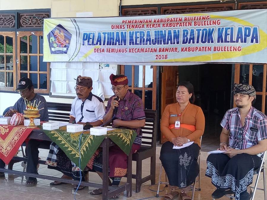 Dinas Tenaga Kerja kabupaten Buleleng yang dalam kesempatan ini mewakili kepala Dinas tenaga kerja , kepala Bidang pelatihan dan produktivitas Ketut Merte S,Sos di dampingi kepala seksi Produktivitas dan Standarisasi Tenaga kerja Nyoman Arsiani s,Sos Membuka pelatihan Kerajinan batok kelapa kelompok yase kerthi di Desa Temukus kecamatan Banjar dengan jumlah kelompok sebanyak 16 orang, pada pembukaan tersebut di hadiri pula oleh perbekel Desa temukus.Babinsa,babinkamtibmas serta instruktur pelatihan batok kelapa,dengan di bukanya pelatihan tersbut di harapkan para peserta nantinya bisa mengikuti kegiatan pelatihan tersebut dengan baik sehingga meberikan mamfaat dan berguna untuk menambah keahlian peserta kususnya di bidang kerajinan batok kelapa dan tentunya jika di kembangkan akan mampu menambah sumber penghasilan bagi para peserta pelatihan.