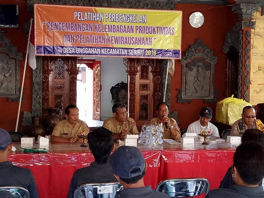 Kepala Bidang Pelatihan dan Produktifitas Ketut Merta S,Sos mewakili kepala Dinas Tenaga Kerja Kab.Buleleng membuka secara resmi pelatihan perbengkelan di Desa Unggahan Kec. Seririt. Pelatihan di ikuti oleh kelompok perbengkelan Harapan Muda desa unggahan sebanyak 16 orang. Sebelum di buka acara di awali dengan laporan ketua pelaksana Gede Suwinten yang dalam lapoeanya menyampaikan bahwa pelatihan perbengkelan di Desa Unggahan dilaksanakan selama 5 hari mulai tanggal 21 s/d 25 Oktober 2019.dalam kesempatan tersebut Perbekel Desa unggahan I Ketut Nasa juga memberikan arahan kepada peserta agar betul-betul mengikuti pelatihan agar nantinya mereka mampu berwirausaha ,di akhir acara juga diserahkan bantuan peralatan secara simbolis kepada ketua kelompok.