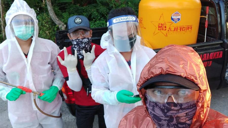 Ada hal yang Tampak berbeda dari kegiatan Penyemprotan Disinfectan Dinas Tenaga Kerja Kabupaten Buleleng dengan Menggunakan APD ( Alat Pelindung Diri ) melaksanan Kegiatan Penyemprotan Desinfektan pada hari Rabu 6 Mei 2020. Kegiatan penyemprotan sesuai arahan Bupati Buleleng dilaksanakan pada pukul 06.00 Wita . Penyemprotan menyasar Wilayah Desa Tejakula, Kegiatan ini dilaksanakan sebagai upaya pencegahan penyebaran Covid-19.