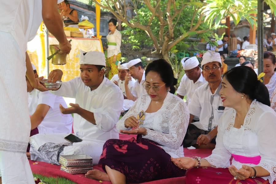 Kepala Dinas Tenaga Kerja kabupaten Buleleng Ni Made Dwi Pryanti Putri K,SE Hadi Dalam Upacara Piodalan di parahyangan Rumah Jabatan Bupati Buleleng, Jumat (24/1). Piodalan ini jatuh setiap Tilem Kepitu. Pidoalan ini dihadiri Bupati Buleleng Puti Agus Suradnyana,ST, Ibu Bupati Buleleng Ny. Aries Suradnyana, Para Camat se-Kabupaten Buleleng, Pimpinan SKPD lingkup Pemkab Buleleng. Piodalan dipuput oleh Ida Pedanda Gede Putra Kemenuh dari Griya Sukasada yang dibarengi dengan penampilan wewalian Topeng Sidekarya.
