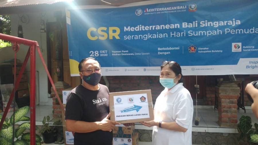 Serangkaian Hari Sumpah Pemuda 28 Oktober 2020 Mediteranian Bali Cabang Singaraja Bekerja sama Dengan Dinas Tenaga Kerja Kabuapaten Buleleng dan Buleleng Sosial Comonity melaksanakan kegiatan CSR bantuan Paket sembako dan pakaian layak pakai kepada yayasan pantai Asuhan Hindu Destawan Desa Sawan Kecamatan Sawan dalam kesempatan ini hadir untuk menyerahkan bantuan Secara simbolis Kepala Dinas Tenaga Kerja Kabupaten Buleleng Ni Made Dwi Pryanti Putri K,SE Direktur Mediteranian Singaraja Edy Gunawan serta perwakilan BSC singaraja, bantuan diterima langsung oleh ketua Yayasan panti Asuhan Hindu Destawan Ketut Sutrisna.