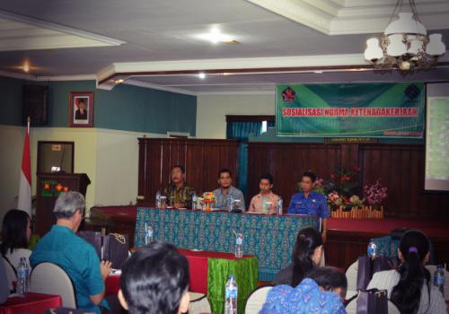 Ketenagakerjaan merupakan permasalahan ketatanegaraan yang tak henti – hentinya setiap hari kita bahas. Banyak terjadinya kasus ketenagakerjaan saat – saat ini terutama di Kabupaten Buleleng adalah pelanggaran terhadap undang – undang ketenagakerjaan yang ada. Banyaknya pelanggaran undang – undang ketenagakerjaan ini disebabkan kurangnya pemahaman baik tenaga kerja dan pihak – pihak perusahaan yang menangani masalah ketenagakerjaan di perusahaan masing – masing, sehingga berdampak pada acap kali timbulnya perselisihan hubungan industrial dikalangan perusahaan. Dinas Tenaga Kerja dan Transmigrasi Kabupaten Buleleng dengan anggaran APBN tahun 2015 DIPA 026.08.3.229016/2015 tanggal 14 November 2014 mengadakan sosialisasi Norma Ketenagakerjaan di Hotel Bali Taman dengan mengundang 30 peserta yang berasal dari 30 perusahaan yang ada di Kabupaten Buleleng. Sosialisasi ini dibuka secara resmi oleh Bapak Dewa Putu Susrama, S.Sos selaku Kabid HI dan PTK yang dalam hal ini mewakili Ibu Kepala Dinas Tenaga Kerja dan Transmigrasi, yang dimana pada waktu yang bersamaan ibu Kadis menghadiri undangan kunjungan Menteri Keuangan di Hotel Melka. Kegiatan sosialisasi memberikan pemahaman kepada peserta mengenai kebijakan penyelesaian perselisihan tenaga kerja, peraturan ketenagakerjaan dan norma ketenagakerjaan. Di dalam kegiatan sosialisasi ini juga diselingi oleh penyajian dari BPJS Ketenagakerjaan dan BPJS kesehatan sesuai dengan tema sosialisasi norma ketenagakerjaan. Melalui sosialisasi ini diharapkan adanya hubungan yang harmonis antara pengusaha dan tenaga kerja di perusahaan.