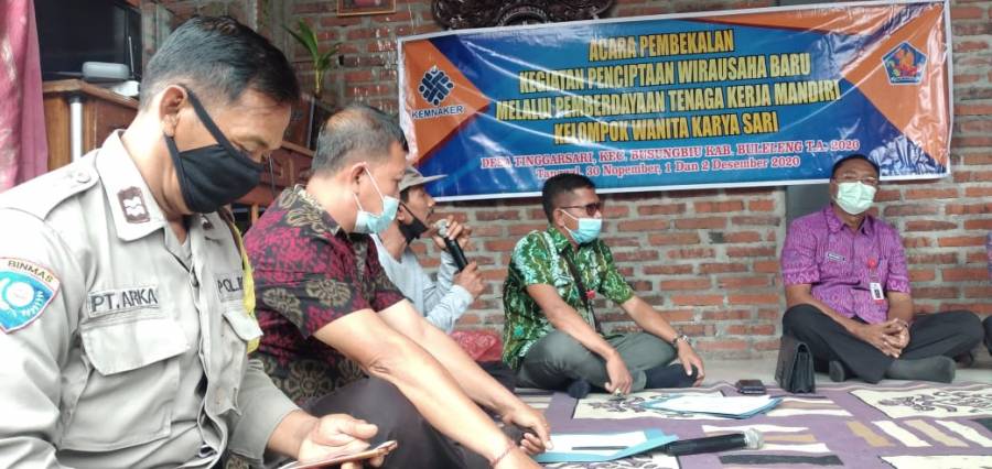 Selasa 15 Desember 2020 Dinas Tenaga Kerja Kabupaten Buleleng yang dalam kesempatan ini Diwakili Sekretaris Disnaker Dewa Putu Susrama S,Sos di dampingi kepala Bidang Penempatan Tenaga kerja dan Transmigrasi Nyoman Susila S.Sos serta kepala seksi Pemberdayaan dan Perluasan Tenaga Kerja I Komang Suardana Melaksanakan Pembekelan Kegiatan Penciptaan Wirausaha Baru Melalui Pemberdayaan Tenaga kerja Mandiri kelompok wanita Karya Sari Desa Tinggarsari Kecamatan Busungbiu kegiatan ini juga di hadiri Kadus Banjar kanginan Putu Subadra Mewakiki perbekel Desa Tinggarsari, Babinkamtibnas Ds Tinggar Sari Putu Arka, Ketua kelompok Nengah Somayasa serta Anggota kelompok Wanita Karya Sari, kegiatan ini terlaksana melalui sumberdana APBN Kemetrian Tenaga kerja Dirjen Binapenta dan PKK Kemenaker RI.