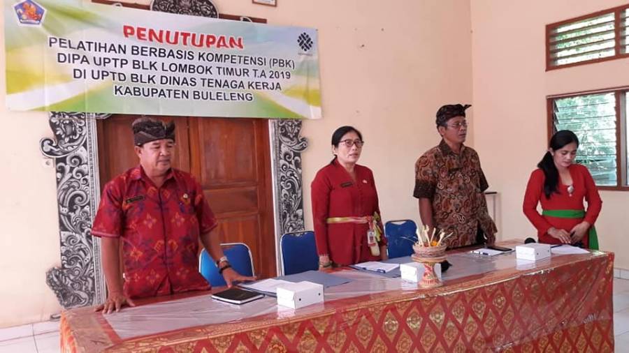 Kepala Dinas Tenaga kerja kabupaten Buleleng Ni Made Dwi Priyanti Putri K SE,menutup secara resmi pelatihan berbasis kompetensi di UPTD BLK(Balai Latihan Kerja) kalibukbuk Kamis 11/07/2019,Sebelum di tutup acara tersebut di awali laporan ketua panitia, yang dalam laporanya menyampaikan bahwa peserta pelatihan di ikuti sebanyak 160 orang peserta yang terdiri dari program pelatihan Spa,Therapis. Penyiapan kamar untuk tamu, Practical office, Service sepeda motor konvensional I Dan II, Pelatihan jahit dengan mesin, Food and baverage product. Front office baverage product, Front office receptionist.waiters dan juru las1 SWAW, Pelatihan selama 45 hari kerja mulai tanggal 30 april s/d 3 juli 2019.sementara itu dalam sambutan kadisnaker menekankan pada peserta agar tidak hanya berhenti sampai disini diharapakan juga kepada para peserta untuk terus berlatih dan mengasah kemampuan sehingga dengan adanya pelatihan tersebut dapat memberikan kemampuan dan skil kepada peserta dalam meraih kesempatan kerja di bidangnya masing-masing .hadir pula dalam kesempatan terebut kepala Bidang Pelatihan dan Produktivitas Ketut Merta ,S Sos.serta Kepala UPTD BLK Kabupaten Buleleng Made Suaspada.