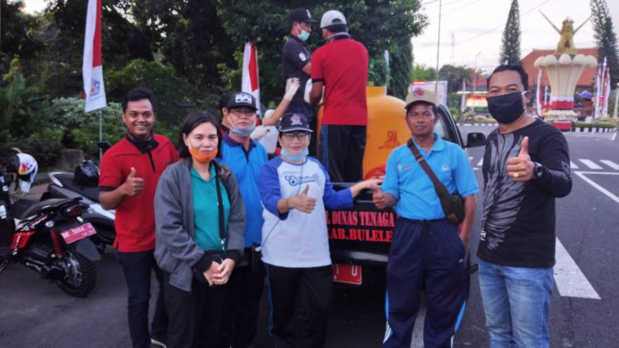 Minggu pagi 29 Maret 2020, Pemkab Buleleng Melalui seluruh OPD Lingkup Pemerintah Kabupaten Buleleng yang Termasuk Diantaranya turut Serta Dinas Tenaga kerja Kabupaten Buleleng kembali melakukan giat penyemprotan Desinfectan di wilayah perkotaan kabupupaten Buleleng Dimana Dinas Tenga kerja Kabupaten Buleleng mendapat Tugas Area penyemprotan didaerah Desa Sangsit yang Dimulai Start dari Rumah sakit Pramtama Hingga jalan pulau Komodo. Desa Banyuning