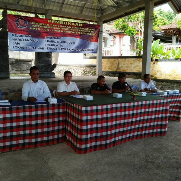 Dalam rangka kegiatan pembukaan pelatihan Dana APBD Tahun anggaran 2018 untuk triwulan ke 2 (dua) pelatihan non institusional berbasis masyarakant kejuruan menjahit yang dilaksanakan di Desa Tigawasa Kecamatan Banjar pada,Rabu 18 April 2018 yang dibuka langsung PLT.Kepala Bidang Pelatihan dan Produktivitas Nyoman Arsiani,para Instruktur,Perebekel Desa Tigawasa,Camat Banjar atau yang mewakili