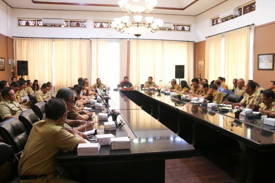 Bupati Buleleng Putu Agus Suradnyana,ST mengumpulkan seluruh pimpinan SKPD dan BUMD untuk membahas kebijakan Pemkab Buleleng dalam mencegah dan menanggulangi penyeberan Covid-19 di Buleleng. Rapat dilaksanakan di Ruang Rapat Loby Kantor Bupati, Senin (16/3). Beberapa kebijakan yang diambil oleh Bupati Agus Suradnyana dalam mencegah meluasnya penyebaran Covid-19 yaitu, Meliburkan sekolah-sekolah dari berbagai jenjang pendidikan terhitung mulai hari ini sampai dengan tanggal 30 Maret 2020, Agenda kegiatan HUT Ke-416 Kota Singaraja yang mengundang banyak orang, atau dapat menimbulkan keramaian dibatalkan, Staf/pelaksana dan pegawai kontrak diijinkan untuk melaksanakan tugas dari rumah. Namun apabila diperlukan untuk melaksanakan tugas-tugas tertentu yang bersifat urgent, staf/pelaksana dan pegawai kontrak tersebut wajib melaksanakannya sesuai dg perintah pimpinan,Terkait dengan pawai ogoh-ogoh serangkaian perayaan Hari Raya Nyepi, Bupati Agus Suradnyana akan mengumpulkan seluruh Bendesa Adat (hari ini) untuk menerima masukan,Terkait dengan kebijakan yang diambil oleh Bupati dimaksud, kami memohon permakluman seluruh stakeholder. Kebijakan tersebut diambil dengan maksud untuk melindungi seluruh masyarakat dari bahaya infeksi Covid-19. Adapun hal-hal yg bersifat administratif terkait dengan kebijakan dimaksud akan ditindaklanjuti lebih lanjut, Turut hadir dalam rapat tersebut kepala Dinas Tenaga Kerja Kabupaten Buleleng Ni Made Dwi Priyanti Putri K,SE.