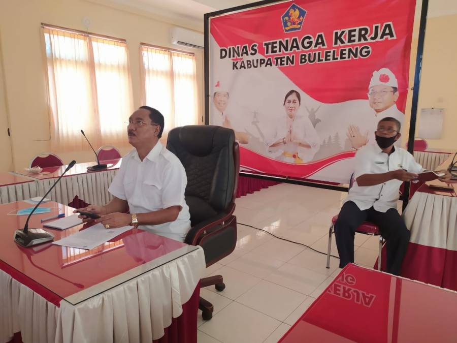 Rabu 5 Agustus 2020 Bertempat di Ruang Rapat Dinas Tenaga Kerja Kabupaten Buleleng Sekretaris Disnaker Dewa Putu Susrama S.Sos Didampingi Kepada Bidang Pelatihan dan Produktivitas Ketut Merta S,sos Mengikuti Rapat Vidio Teleconfrece Terkait tatanan hidup di era baru dalam ketenagakerjaan yang Diselengarakan Oleh Kementrian Ketenaga Kerjaan Republik Indonesia