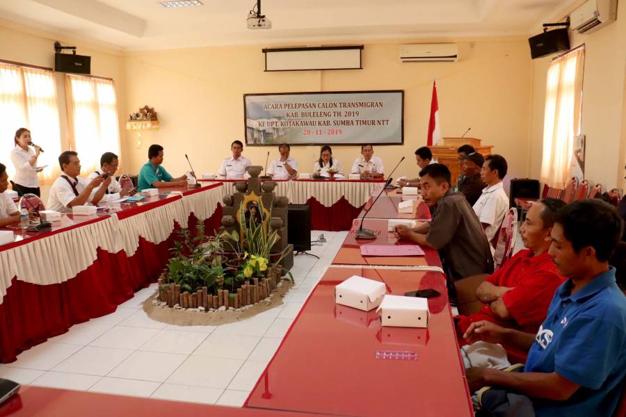 Sebanyak 5 KK dengan total 20 anggota keluarga transmigran asal Buleleng dilepas secara resmi oleh Kepala Dinas Tenaga Kerja (Disnaker) Kabupaten Buleleng, Ni Made Dwi Priyanti Putri Koriawan, SE, mewakili Bupati Buleleng, Putu Agus Suradnyana, ST, bertempat di Aula Kantor Disnaker Buleleng, Rabu (20/11). Nantinya pada Hari Minggu 24 Nopember 2019 pagi, para transmigran diantar menuju Denpasar untuk pemeriksaan kesehatan, pemberian perlengkapan, kemudian Senin 25 Nopember 2019 Transmigran Buleleng bersama dengan seluruh transmigran asal Bali akan dilepas secara resmi oleh Gubernur Bali menuju lokasi transmigrasi yakni ke wilayah Kabupaten Sumba Timur, Nusa Tenggara Timur.