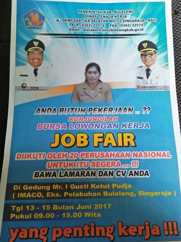 Dalam kesempatan job fair ini Kadis naker Ni Made Dwi Priyanti Putri K SE berharap dengan diadakannya Job Fair yang bertempat di Ex Pelabuhan Bulelelng selama 3 (tiga) hari masyarakat yang belum mempunyai pekerjaan bisa memilih pekerjaan yang diminati maupun menyesuaikan pendidikan atau skill yang telah dikuasai selama bersekolah atau mengenyam pendidikan,karena bursa kerja ini menampilkan 20 (duapuluh) perusahaan baik yang akan memperkerjakan didalam maupun luara negeri.