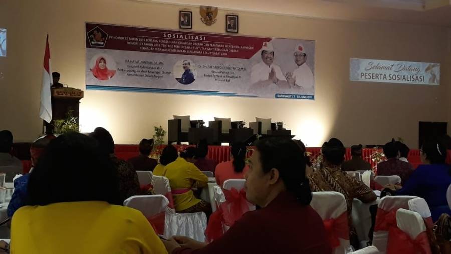 Mewakili Bupati Buleleng Putu Agus Suradnyana, ST,Asisten Bidang Administrasi Pemerintahan Setda Kabupaten Buleleng Putu Karuna, SH membuka secara resmi kegiatan sosialisasi yang diadakan 2 hari dari tanggal 27 sampai dengan 28 juni ini. Dalam sambutannya, Putu Karuna, SH menjelaskan dengan berlakunya peraturan pemerintah nomor 12 tahun 2019 tentang pengelolaan keuangan daerah, dan peraturan menteri dalam negeri nomor 133 tahun 2018 tentang penyelesaian tuntutan ganti kerugian daerah terhadap pegawai negeri bukan bendahara, kewajiban pemerintah daerah untuk mengimplementasikan kesatuan tersebut dalam penyelenggaraan desentralisasi tugas kewenangan daerah khususnya dalam hal pengelolaan keuangan daerah.