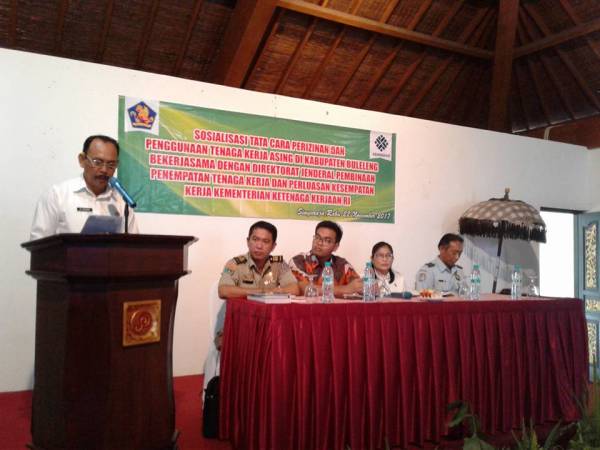 Dinas Tenaga Kerja Kabupaten Buleleng mengadakan sosialisasi tata cara perizinan dan penggunaan tenaga kerja asing di Kabupaten Buleleng bekerjasama dengan Derektorat jenderal pembinaan penempatan tenaga kerja asing dan perluasan kesempatan kerja kementerian ketenagakerjaan RI yang bertempat di Hotel Puri Saron,hadir Kepala Dinas Tenaga Kerja Kabupaten Buleleng Ni Made Dwi Priyanti Putri K SE,didampingi Kepala Bidang Pelatihan dan Produktivitas Gede Ardenen,para Kepala Seksi Bidang Lattas maupun Staff, Kepala Kanwil Imigrasi Singaraja,Pengawas Ketenagakerjaan,Direktur PPTKA Kementerian Ketenagakerjaan RI beserta 5 orang tim sebagai nara sumber serta undangan peserta sebanyak 50 orang berasal dari kalangan perhotelan,restaurant,LPKS yang sudah maupun belum menggunakan tenaga kerja asing.