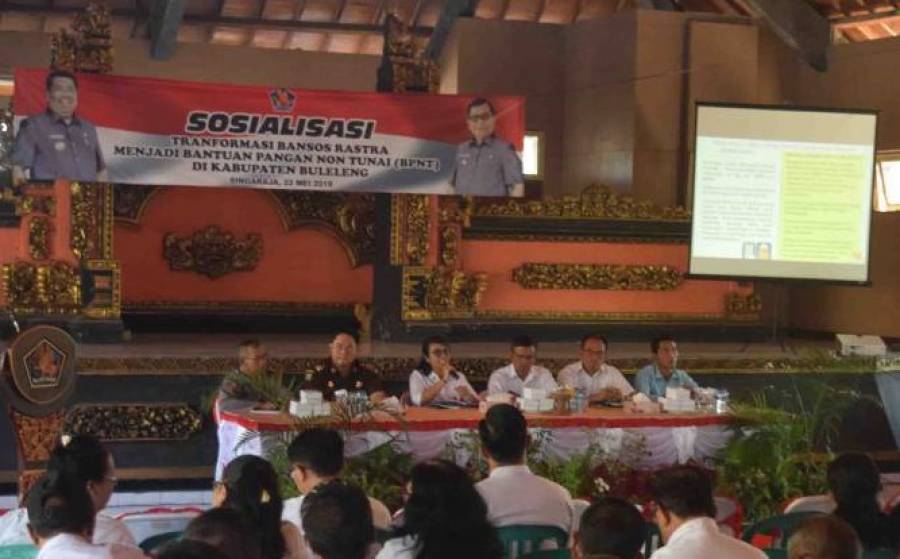 acara tersebut di buka secara resmi oleh Asisten Bidang Ekonomi Pembangunan, Kesejahteraan Rakyat dan Layanan Pengadaan Setda Buleleng,Ni Made Rousmini, S.Sos, mewakili Bupati Buleleng, serta diikuti oleh seluruh Anggota TIM Koordinasi program bansos pangan Kabupaten Buleleng, Camat Se-Kabupaten Buleleng, Perbekel dan Lurah Se-Kabupaten Buleleng, Kasi / Kaur yang menangani bansos pangan di Desa/ Kelurahan dan Pendamping bansos pangan Kecamatan.dalam sambutan Bupati Buleleng yang dibacakan asisten I Ni Made Rousmini, S.Sos ,sosialisasi ini untuk memberikan pemahaman mengenai mekanisme Program Bantuan pangan Non Tunai (BPNT) agar nantinya Program ini dapat dilaksanakan sesuai dengan ketentuan dan aturan yang berlaku.Bansos Pangan Rastra menjadi Bantuan Pangan Non Tunai (BPNT) yang dituangkan dalam PERPRES NO. 63 Tahun 2017 Tentang penyaluran bantuan sosial.