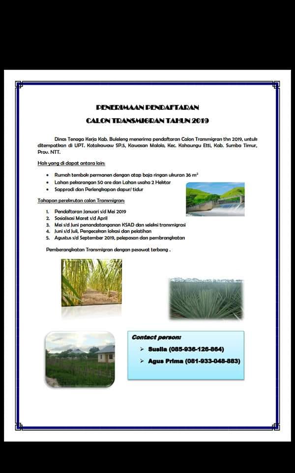 Anda berminat dan berbakat mnjadi seorang transmigran dan ingin menata masa depan yang lebih baik,.... Ayo segera mendaftar ke Dinas Tenaga Kerja Kab Buleleng Jln Dewi Sartika 22 Sgr. Penempatan Prov Bali th. Ini ke Kab Sumba NTT. Anda kan mndapatkan hak rumah permanen ukuran 36 m2,dengan pekarangan 50 are dan lahan usaha2 hektar. Syarat a. L. Umur maks. 50 th. KTP, KK, photo Dll. Daftar sgr.
