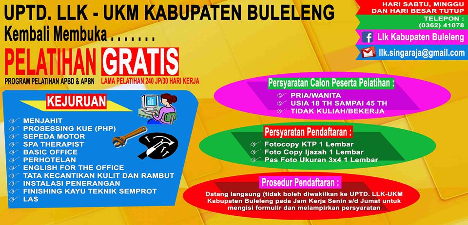 Bila ingin bekerja di sebuah perusahaan harus memiliki skill yang di perlukan oleh perusahaan tersebut maka dari itu ikutilah pelatihan gratis di UPTD LLK UKM Kalibubuk selain itu bisa juga setelah ikut pelatihan membuka usaha sendiri sesuai dengan bidangnya.